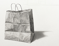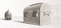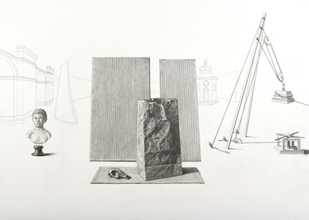 On Steven Carrelli Containers, distances, shadows, and associative thinking, the poetry of solid objects, the surrealism in slightly altered perspective, measurement, mathematics, displacement...a sense of intransigence. Bags, all those bags, and packages deprived of natural light, seemingly in media res, but arrested. The space between the objects in Steven Carrelli's work is time, not only temporal disjunction, but the way time inheres to things, to lines, to texture, to almost obsessive detail that brings the object to life, but also brings us to the sense of time etched in process. In "Improvised Landmarks" a toolbox looms in the foreground, architecturally, while some distance away (what is distance?) is...what? A miniature Brunelleschi dome covered a la Christo? A very unhappy kumquat? Is it a large lunchbox, after all? No. In the background, the outlines of a wooden wall, barn-like, incomplete, its lines stretching like a web out toward the lunch box, establishing connection. A long shadow points from the box to the draped object. It points. What's underneath is a conception that requires opening one box and lifting a veil. That tools are landmarks shouldn't be lost on us, as we think about the way the light hits the side of the box responsible for everything - how bright it is, how impossible the necessary wash of the front. In "Ruins in Progress" my first response is "rebus": Bust and paper bag and cardboard and skeletal head and primitive construction crane invented by Filippo Brunelleschi, and the word is...My second response is that the bag (school lunch?) and the small skull are on stage. Everything's a ruin. You are. Filippo Brunelleschi? Don't ask. What's in the bag? A cathedral, a sandwich? What's in the cathedral? A mouse, a bag. And I'm bothered by the shadows, that seem brief, rather than short. The light has an internal dynamic that is slightly maddening. Tiny memento mori shadow of the skull, the lunar shadowing of the bag, the sideways shadow to the edge of the canvas of Filippo Brunelleschi's crane. Stare at the line down the middle of the bag - reusable, disposable - do we put the skull inside? - a question mark almost forms. And who is the figure of the small sculpted bust? Our small implacable double gazes out over our shoulder. He's bag sized. And sometimes, even the shadow of a bag is alive. A bag that's seen better days. A shadow that's curious. An unmarked mag. A shadow marking time. A shopping bag, creased most heavily at the bottom, and lined widely further up. How can the handles have stayed so jaunty? The shadow's a virtual tourist of light; it's a slightly ominous cat, eminently ready for its next move. "Location with Views" is the Northern Renaissance through a looking glass. Or a mirage, the outline of historical desire. Are we thinking about a room with a portal? Is the past, is painting, is the history of art an Étant donnés? Are we seeing what we shouldn't see and know we must? There is the sense in Steven Carrelli's work that we are seeing what we have to see, though we frequently haven't ever seen these things before: these bags, these views to another time, these little cathedrals.