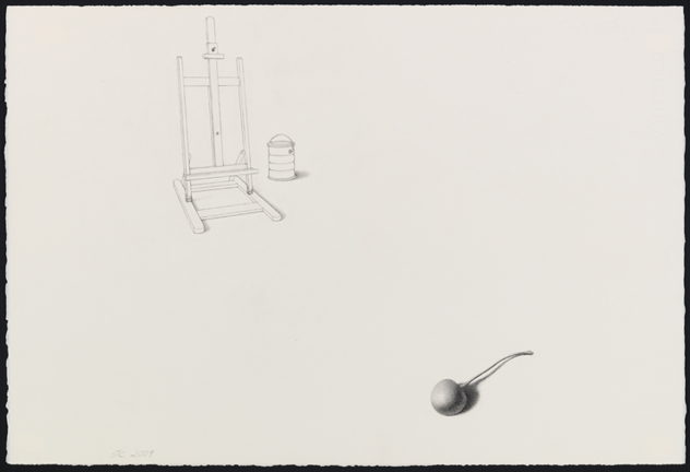 Where our troubles are all the same, This essay originally appeared in the catalog essay for an exhibition titled ___place in 2009 at the Columbia College Chicago A+D Gallery. It is reproduced with permission of the author. ______________________________________ Not so long ago, I was on my way home when I took a wrong turn. I had been absentminded, so my misstep put me in an unfortunate predicament: the surroundings were unfamiliar and I no longer knew where I was. What is more, it was unclear which direction I was facing, and I could not retrace my steps. As I remember it, this moment of displacement brought with it an experience of cold anxiety and embarrassment (you see, more than once I’ve claimed to have a good sense of direction, and this state of affairs offered too many reasons to dispute that claim). Surprisingly, the confusion also included a jumpy excitement. My imagination raced. This could be anyplace. Who lurked in those nearby shadows? What was that sound? How would I find my way? My anxiety lasted for about as long as it took me to find the mobile device in my pocket (the salesperson assured me it was worth its price – it was enabled with a “GPS” system). Once I figured out how the thing worked, it not only charted the lay of the land, it also showed “me” on a digital map. My imagination crashed. As the handheld guided me towards my destination, any adventurous excitement faded – my place was just ahead, on the left. Imaginations have long been captured by sight of unfamiliar places from either long ago or far, far away; most especially when the places were far away long ago. Distant places and mysterious spaces have been topics of art since ancient times. In turn, artworks have long seemed to offer their viewers visions of dated images and even older worlds. New places and even newer images have found their way into recent art as well – one critic has recently argued that narratives of place are central to the very definition of contemporary art.1 However, offbeat places and dissonant eras have produced multifarious pictures, which is why historical accounts are not just descriptions of spaces and times, they are also representations of events and practices.2 The idea of place is as central to art now as it was in ancient times, which suggests the notion has a strange, timely character. Specific notions of a place are straightforward enough, but what is it about the concept of “place” itself that is peculiarly exiting? What does it mean for people and things to be in place? How do people use place right now? Is it different from how place worked before? What, if any, is the difference between place and space? These sort of philosophical questions are tricky at best. This much is certain: the question of place is intimately connected to seeing in a special way. After all, looking at a place is not the same as looking in a place. This essay thinks through some of these issues. It is an attempt to sketch out some questions coming from a specific space – the A+D Gallery’s exhibition ___place. This is an exhibition of four artists who produce works that maintain intimate relationships to place. Take, for example, the misplacement in Abnormal Formal, an artwork by Anna Kunz. This installation of found materials seems to trouble the distinction between something in place and something out of place. In this artwork, viewers are invited to be part of the work, both physically and conceptually. The placement of the found objects Kunz assembles and paints are visible from the storefront window of the gallery, which allows the images produced by this work to spill out beyond architectural boundaries. Kunz troubles divisions between the space outside and the place inside, but she also confounds conventional ideas about painting. In Abnormal Formal colorful paint interacts with the gallery’s architectural space and three-dimensional volumes to generate an absorbing, immersive environment. It is as if items of the everyday world have chosen to assemble in one place and communicate in languages of color and composition. Composition relates to the everyday use of place. It may also seem to make the meaning of “place” more clear: as a noun, place is either unbounded space or a room, but either way, it is an available space that can be arranged and occupied. This definition suggests that a space becomes a place only once objects have been moved in. To notice this is to bring time into the place-making process – how long does it take for a space to become a place? Place refers to continuous or unbounded extension in every direction, but it has a strange relationship to time. Steven Carrelli’s artwork seems to bring time and place together. The objects in Carrelli’s carefully rendered graphite drawings work in concert to activate their surroundings. The Space Between is an efficient example. In this drawing three objects work in concert to declare both tense ephemerality and fragmented density. Look at the contour drawing of the easel and barrel together in the background. Carrelli’s precise pencil marks activate the pristine area in which they are placed. In a similar way, a foreground is activated by a solitary cherry rendered in volumizing chiaroscuro. These three forms work in concert to emplace a distancing mid-ground. Carrelli’s drawings are quietly historical. They invent space through illusionistic perspective, but they also invent time through reference to past eras (the European Middle Ages and Renaissance) and far places (Italy). In these drawings the past is recalled and spaces are revisited – place becomes an active verb. Look, for example, at Spacesuit by Betsy Odom. Odom is conscious of paradoxes that come out of small movements of place, space and time. Spacesuit occupies a domain between craft and sculpture, functionality and fecklessness. The soft sculpture points towards markers of identity and belonging, zones of competence and a